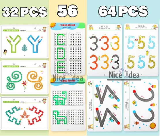 56 Páginas: Caderno de treino, contém o alfabeto completo, números de 0 a 9 e desenhos para reproduzir. ( Recomendado a partir de 3 anos )